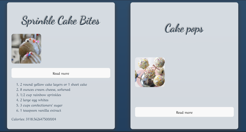 Home page: The home page contains a list of recipes and a search box to search for the ingredients for the recipe. The recipe with the closest match to the query will be displayed first. Upon pressing the read more button,the ingredients required and the calorie count are displayed
